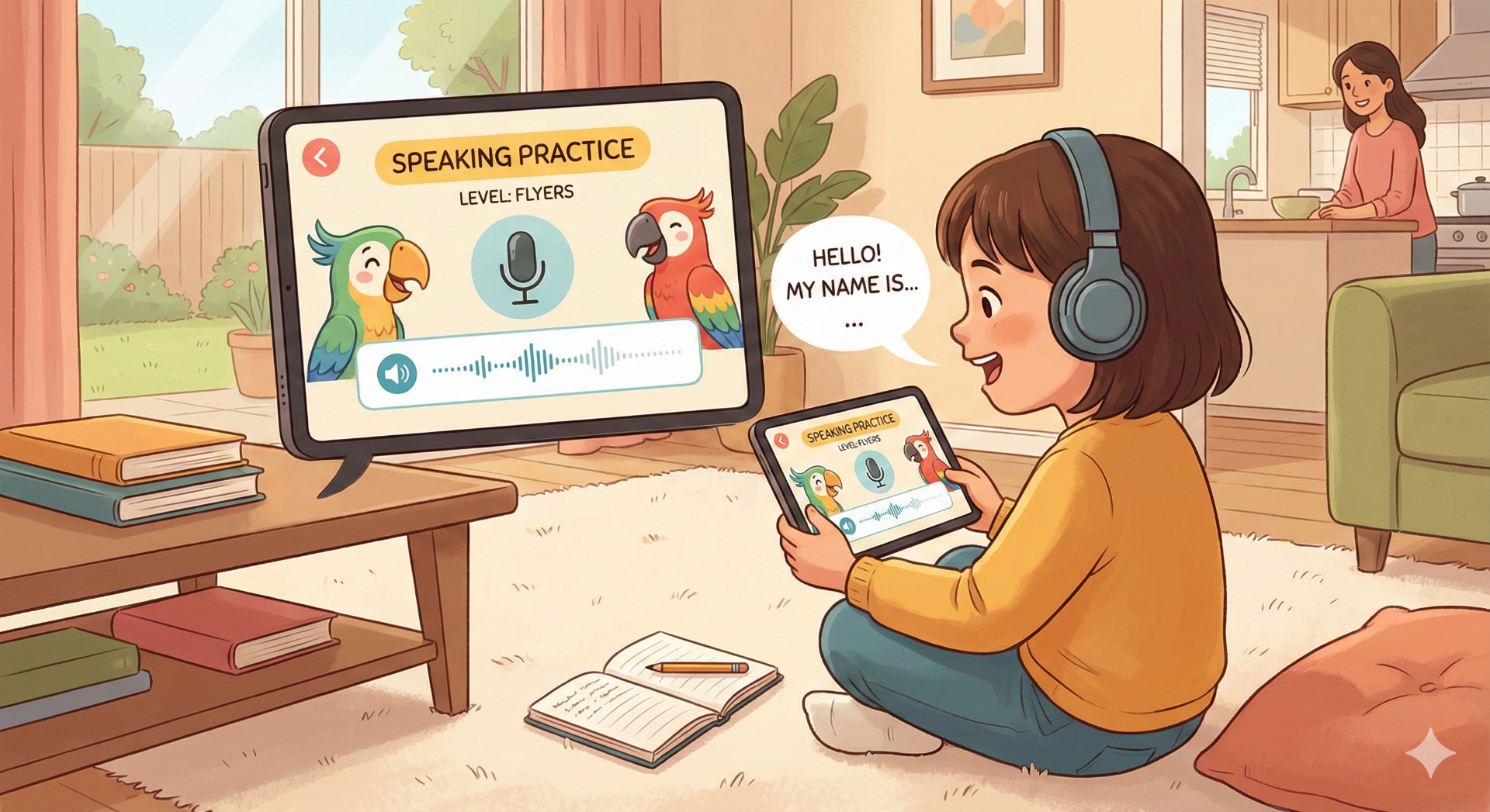 Bé nhà mình sinh năm 2019 (trình độ Flyers), mình cần tìm app giúp con tự luyện nói và phản xạ tiếng Anh tại nhà thay vì học 1:1. Nhờ mọi người tư vấn.